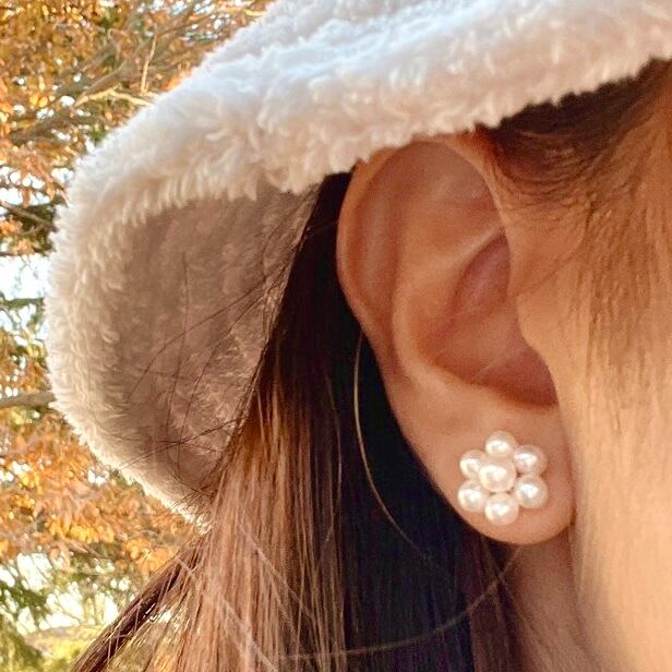白の淡水パールが顔まわりをパッと明るく、華やかにしてくれます。