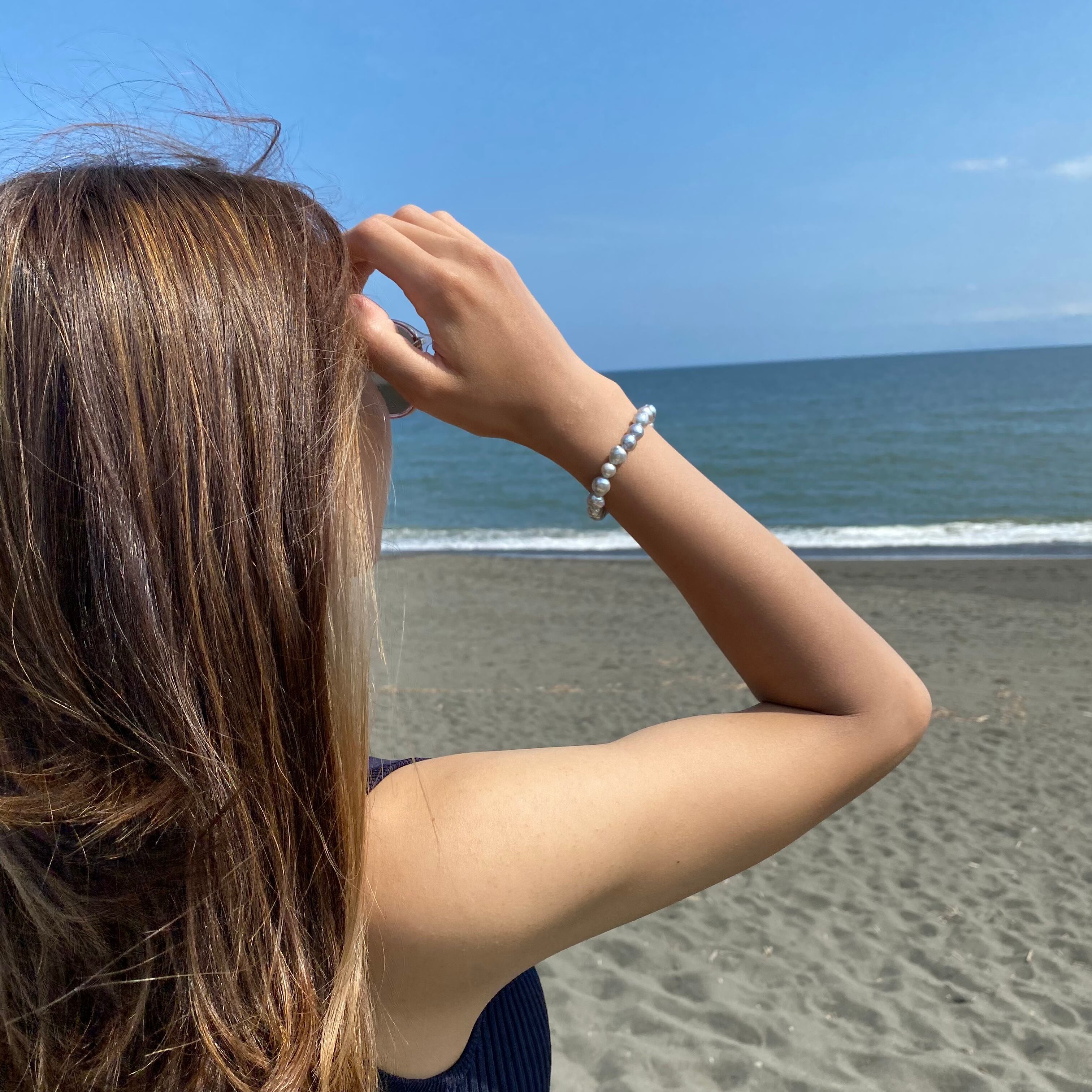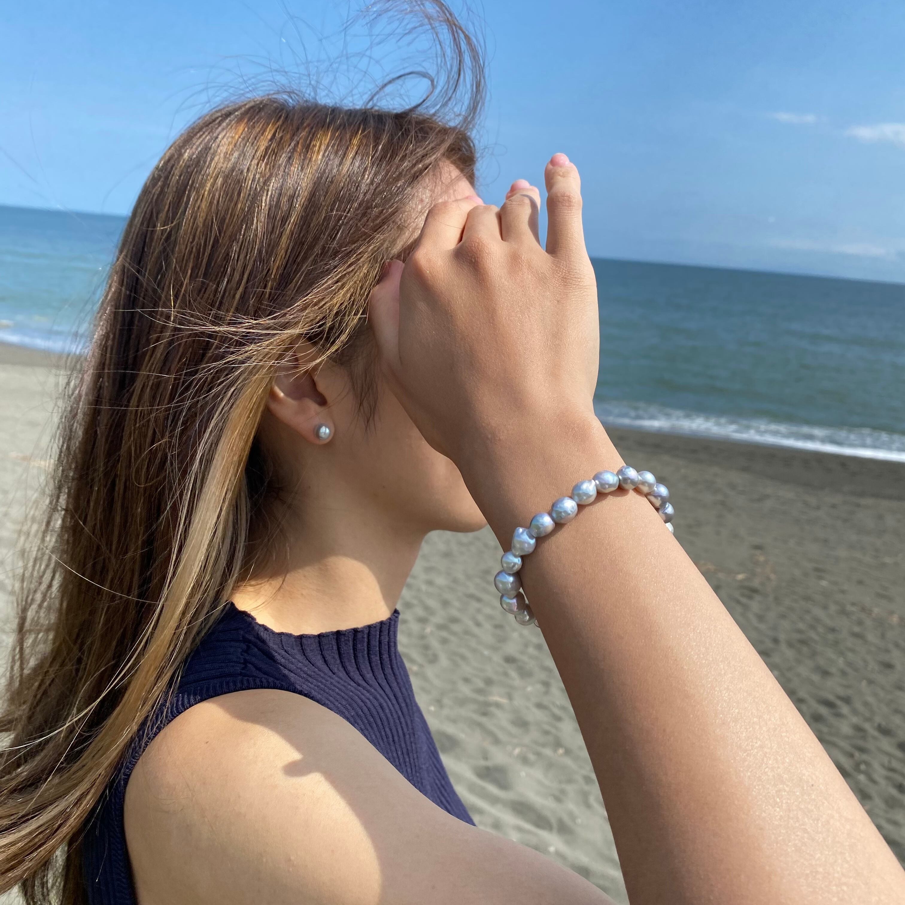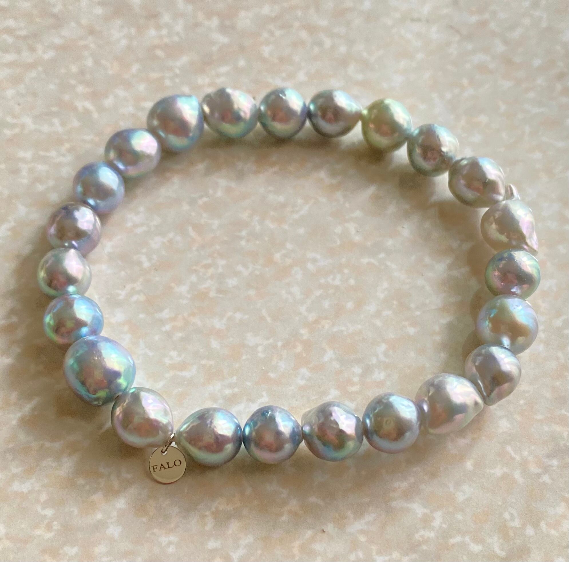 テリの良いナチュラルブルーのバロックあこやを装着しやすいゴムブレスにお仕立てしました。